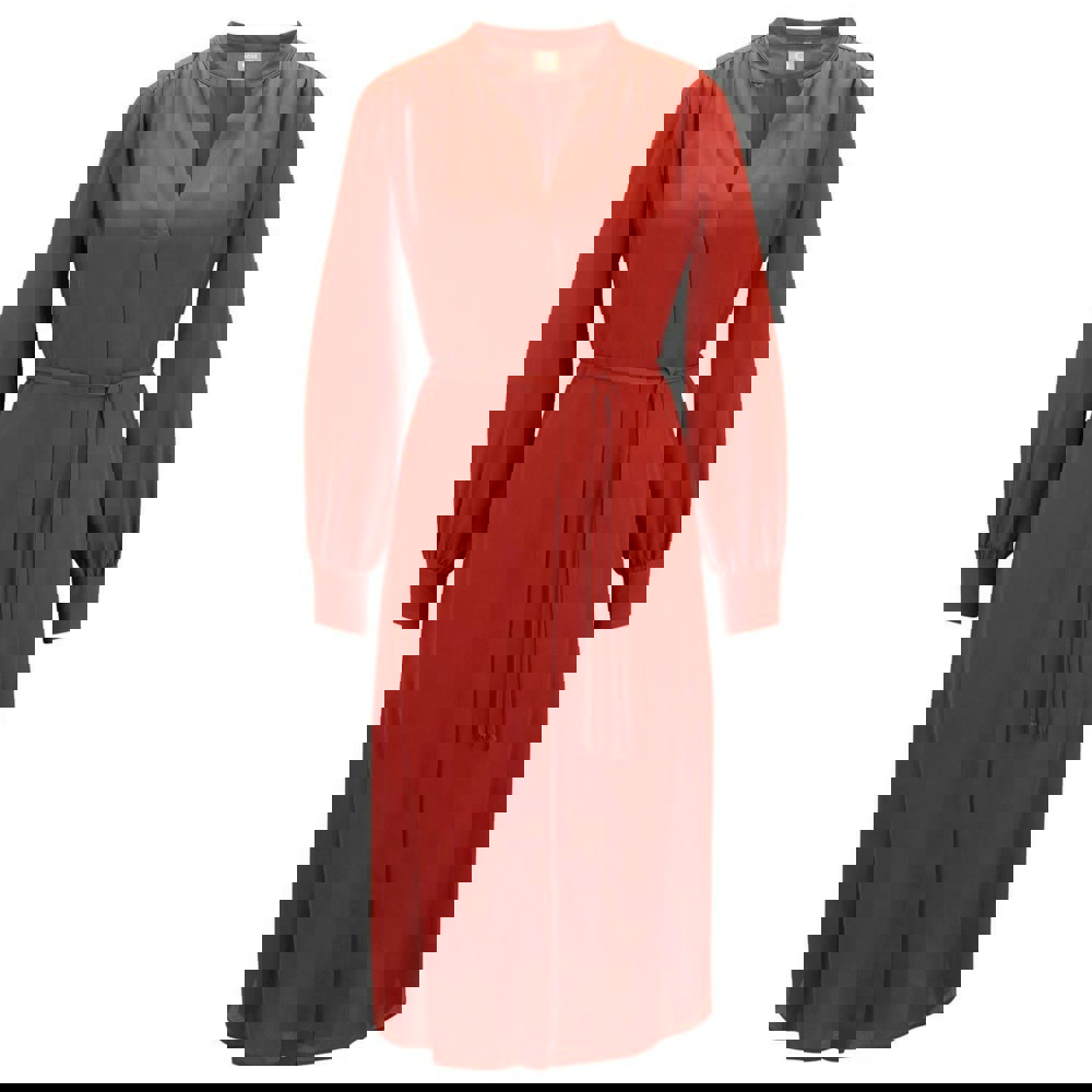 A mandarin collar sits above a shirred V neckline for added texture at the front. Long sleeves are finished with button detailing and a puffed shape, giving the design a structured, modern profile.