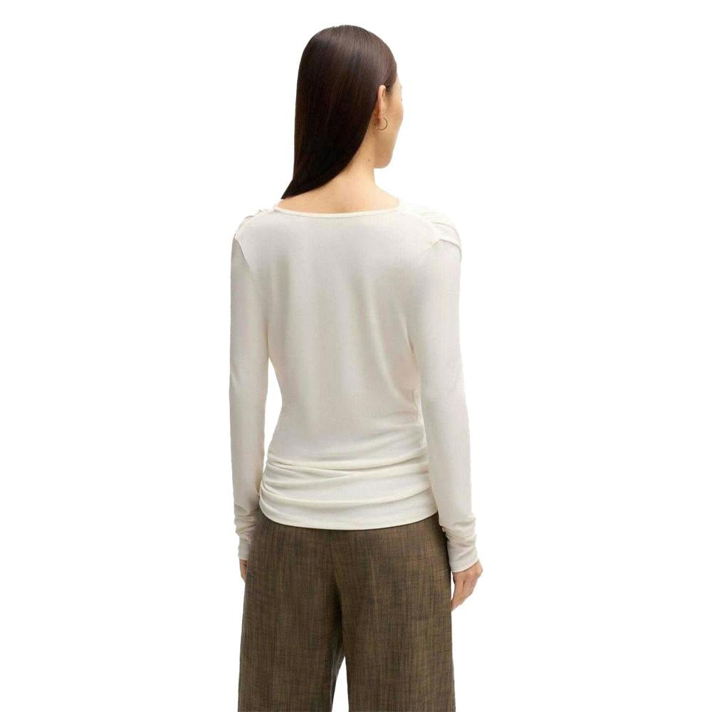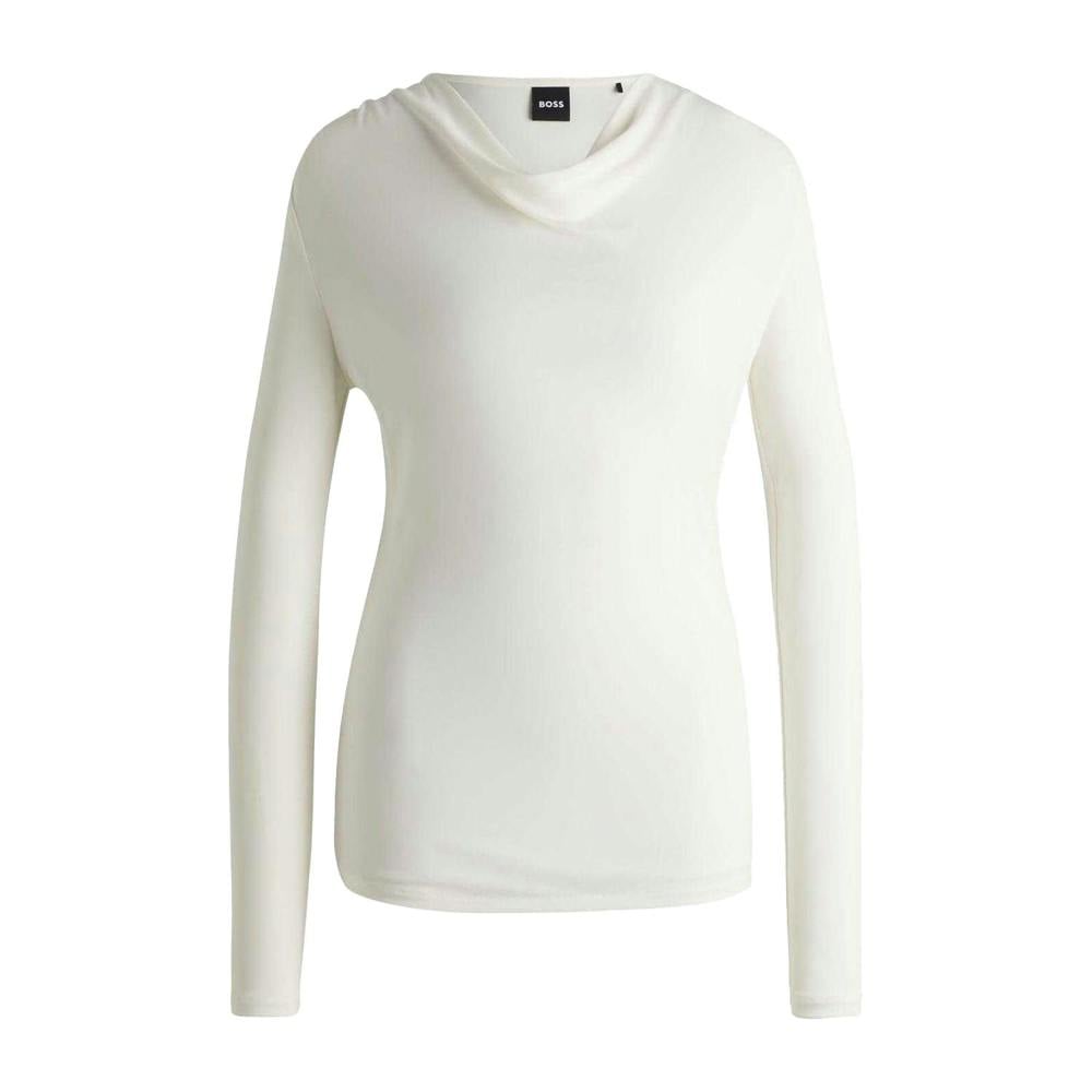 This long-sleeved T-shirt is made from 100% viscose with a stretch fabric construction. It comes in a plain white finish and is shaped with a cowl neckline for a soft drape at the neck. The length measures 61cm, making it easy to wear on its own or as a layering piece.