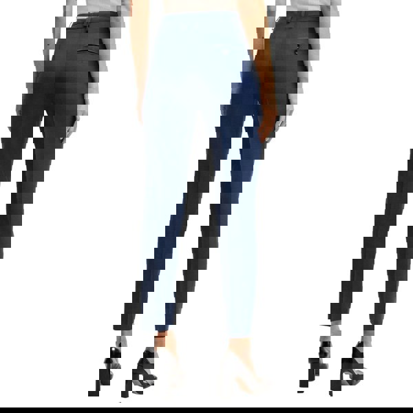 Practical pocketing includes two side pockets and one back pocket. The back pocket is buttoned, and the pockets are cotton lined.