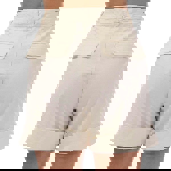 Practical details include belt loops and a button fastening with a concealed zip fly. Storage is provided by two side pockets and buttoned back pockets, while a turn-up hem completes the silhouette.