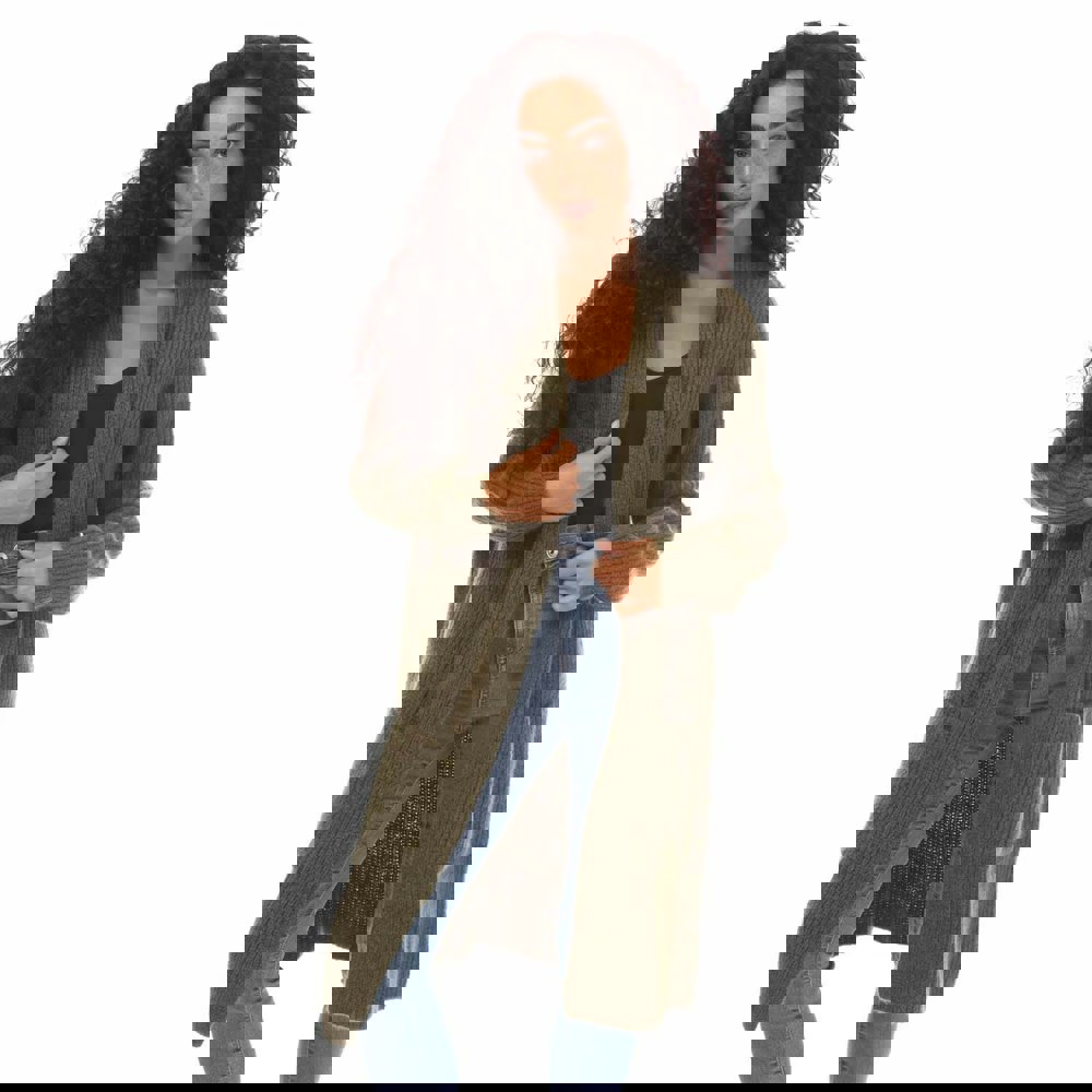 This long-length cardigan is knitted from a blend of 44% polyamide, 34% alpaca wool and 22% wool. It comes in green with a plain finish and ribbed detailing for a clean, structured look.