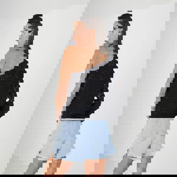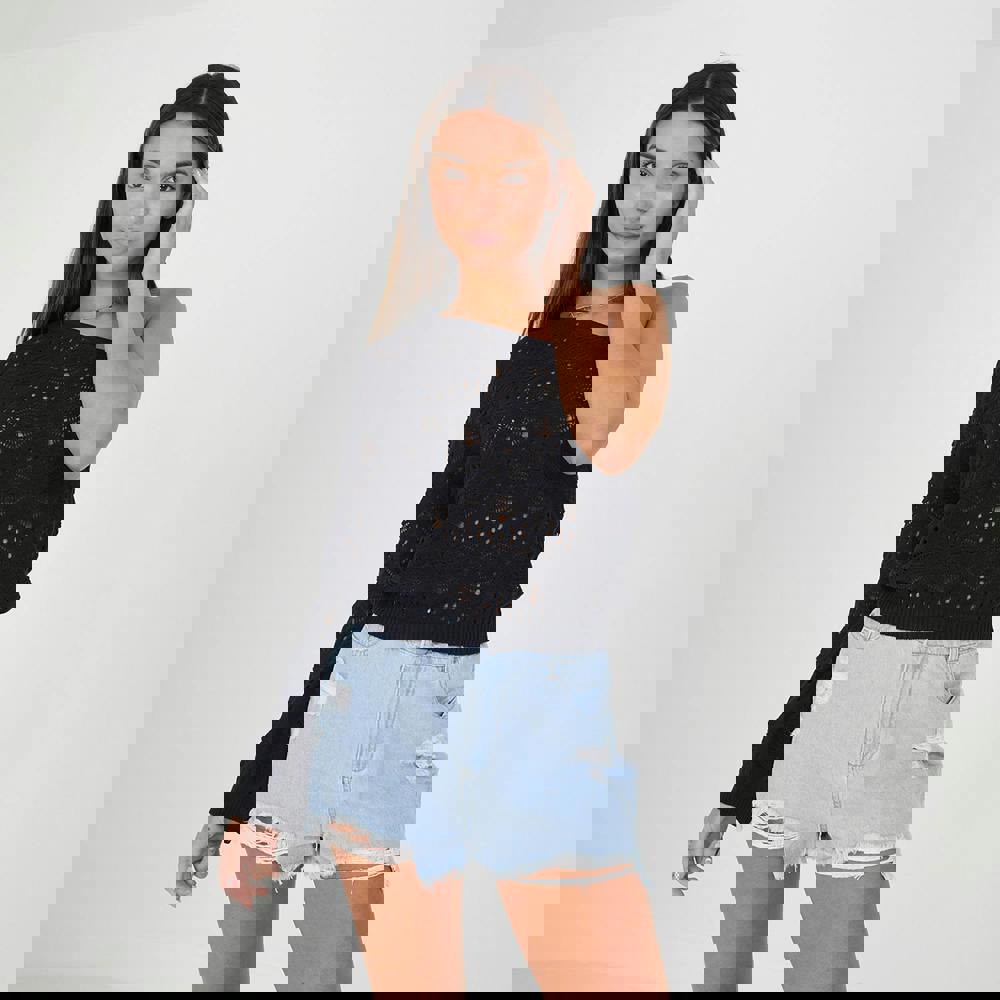 Elevate your summer wardrobe with this asymmetric jumper. The off-the-shoulder design features an all-over pointelle stitch, wide sleeves, and ribbed hem and cuffs. Team with a pair of shorts for the perfect casual look. Model wears UK size S.