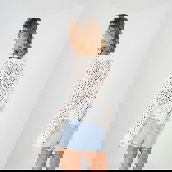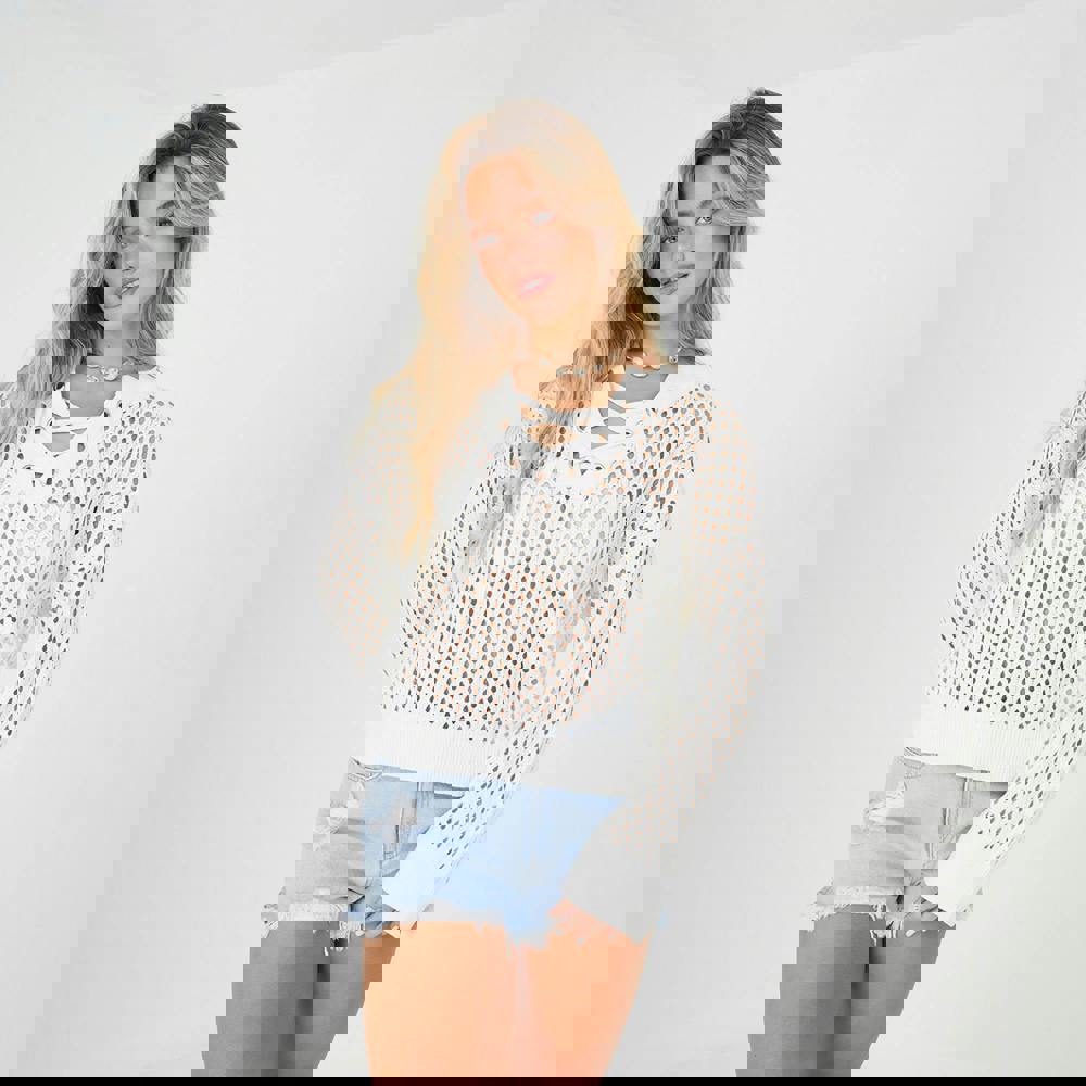 Introducing this open-knit jumper. Crafted from 100% Cotton and featuring a standout eyelet lace-up collar, the perfect throw-on layer. With ribbed collar, hem, and wide cuffs ensuring effortless comfort all day long. Model wears UK size S.