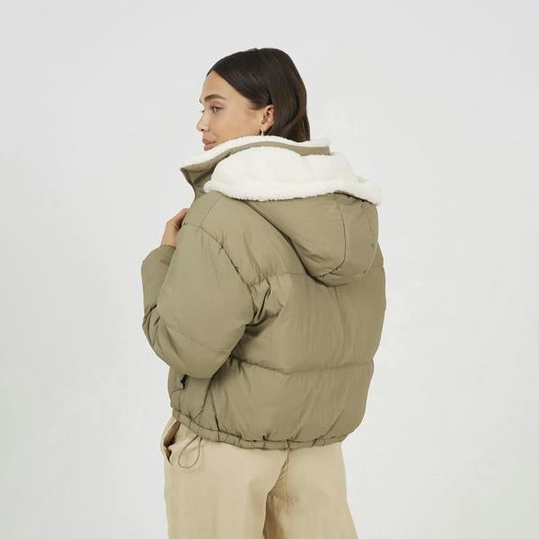 Tackle the cold in style with this puffer jacket, crafted from crinkle Taslan fabric, it features a cosy borg-lined fixed hood for added warmth. The elasticated cuffs and adjustable bungee cord hem lock in heat, while two welt pockets offer everyday functionality. A perfect mix of comfort, texture, and urban edge. Model wears UK size 8.