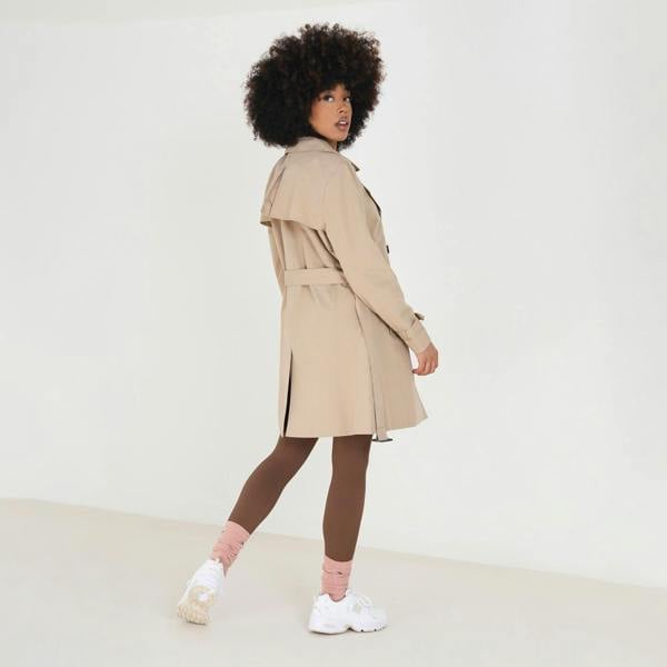 Introducing this classic double-breasted mac, the perfect combination of style and sophistication. Designed in a shorter length, the double-breasted style gives it a timeless appeal. This style features a belt with functional buckle and two side pockets. The regular fit allows for comfortable wear, while the machine-washable fabric makes it easy to care for. Available in other colours. Model is 5’8 and wears UK size 8.