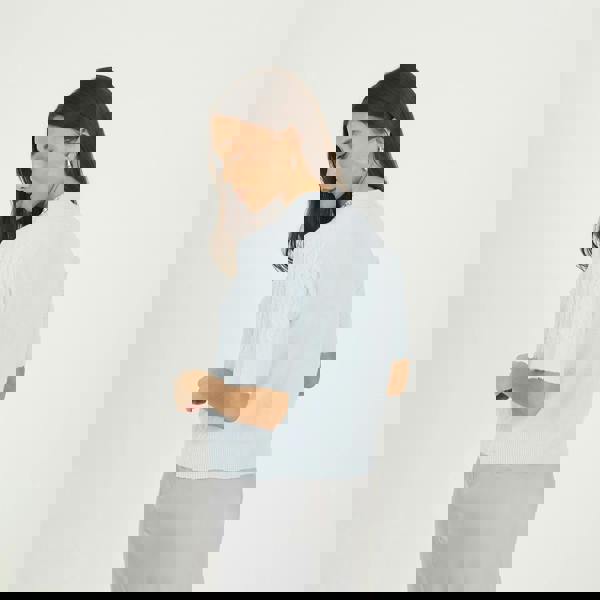 Elevate your knitwear with this cardigan. Featuring short sleeves and a classic crew neck, it combines a front cable knit with a soft back jersey knit for comfort and style. Finished with a jewelled neck detail, this versatile cardigan adds a touch of sparkle and sophistication to any casual or smart-casual outfit. Model wears UK size S.