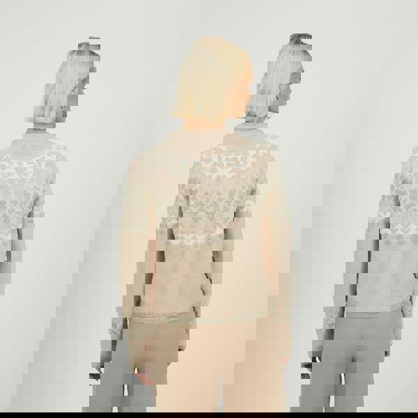 Add a touch of charm to your knitwear collection with this cardigan. Featuring long sleeves, a round neck, and a classic fairisle pattern across the chest and sleeves, it’s finished with faux pearl buttons for an elegant twist. Ribbed neck, cuffs, and hem provide a cosy, polished fit—perfect for seasonal layering. Model wears UK size S.
