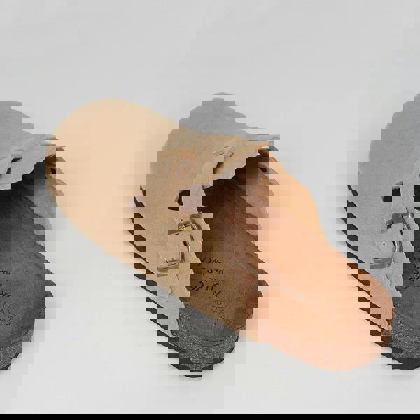 Slip into effortless summer style with these mule sandals. Featuring a soft faux suede upper and classic mule shape, these sandals are designed for all-day comfort and easy wear. The cork footbed offers lightweight support, with front strap detail with an antique gold buckle. Perfect for everyday wear, whether you're relaxing at home or heading out.