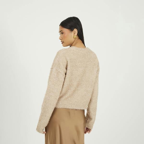 Add a touch of sparkle to your knitwear with this cardigan. Crafted in a soft, fluffy tinsel knit, it features a round neck and long sleeves for a cosy feel. Finished with gold button fastening, this statement piece blends comfort with a glamorous edge—perfect for day-to-night styling. Model wears UK size S.