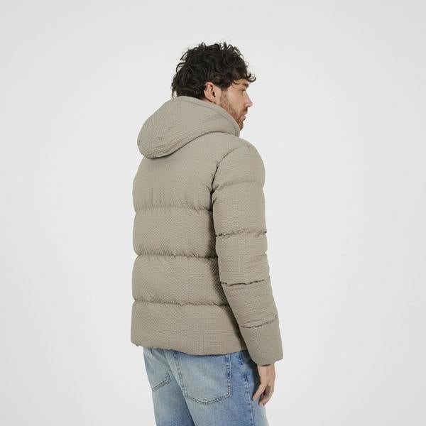 Gear up for colder days with this hooded padded jacket. Designed with all-over textured fabric and full-body padding, it offers warmth without bulk. The fixed hood with toggle adjusters and ribbed cuffs help seal in heat, while zipped lower pockets add secure storage. Style it with jeans and a crew neck knit for a laid-back, winter-ready outfit.