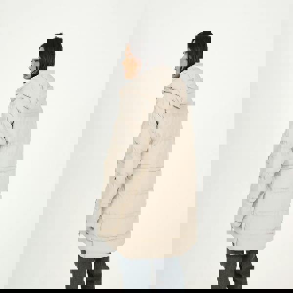 Stay stylishly and cosy in this hooded jacket, cut in a longer length for extra coverage. This padded design features a fixed hood, zip closure, and a drawcord waist for a custom, flattering fit. Finished with two lower welt pockets, it’s the perfect balance of practicality and everyday cold-weather style. Model wears UK size 8.