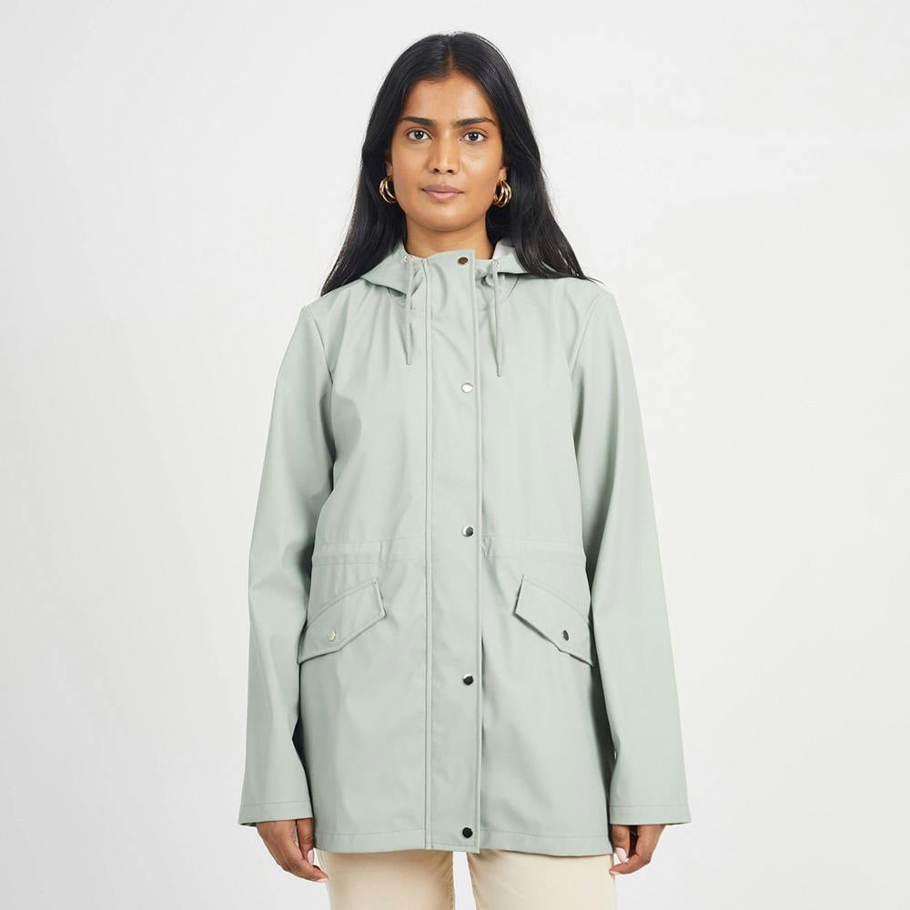 Stay dry in style with this rain mac, a practical yet fashionable outerwear essential. Designed with a mid-length cut, it features a zip and stud popper fastening, two front pockets, and a hood with eyelet and drawcord detailing. An internal drawcord waist allows for adjustable shaping, making it both versatile and functional. Model wears UK size S.