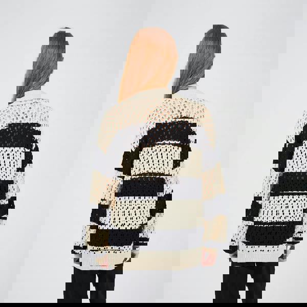 Add a stylish touch to your wardrobe with this stripe open-knit jumper. Featuring a chic open-knit mesh stitch, this jumper offers a breathable and lightweight design, perfect for layering over your favourite tops or wearing on it’s own during the warmer months. The V-neck enhances the relaxed fit and is designed with a ribbed collar, cuffs, and hem. Model wears UK size S.