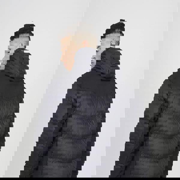 Upgrade your outerwear with this longline jacket. Featuring a funnel neck and fixed hood, this jacket showcases all-over quilting with panel details on the chest, sides, and sleeves. Elasticated cuffs and two lower pockets complete the design, combining style, functionality, and contemporary comfort for everyday wear. Model wears UK size M.