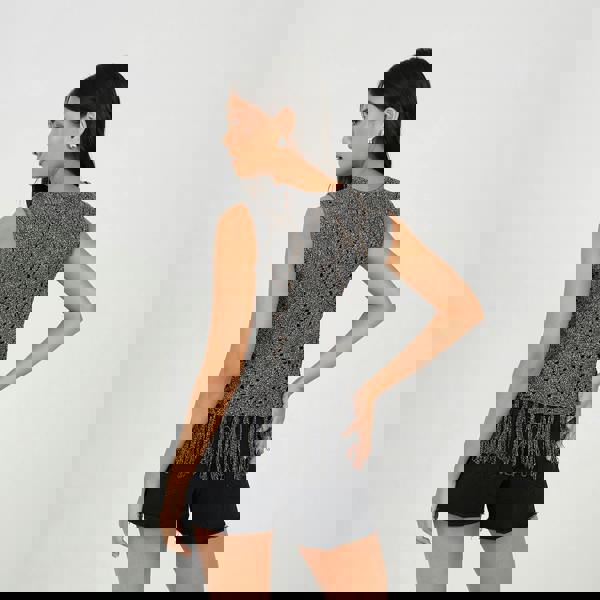 Add a touch of style and sophistication to your wardrobe with this waistcoat designed with a flattering tie-front feature, it offers a customizable fit. The metallic thread woven throughout creates a subtle shimmer, while the all-over knitted pattern adds texture. Complete with tassel detailing at the hem, this waistcoat brings a boho-chic vibe to any outfit. Perfect for layering over dresses or tops. Model wears UK size S.