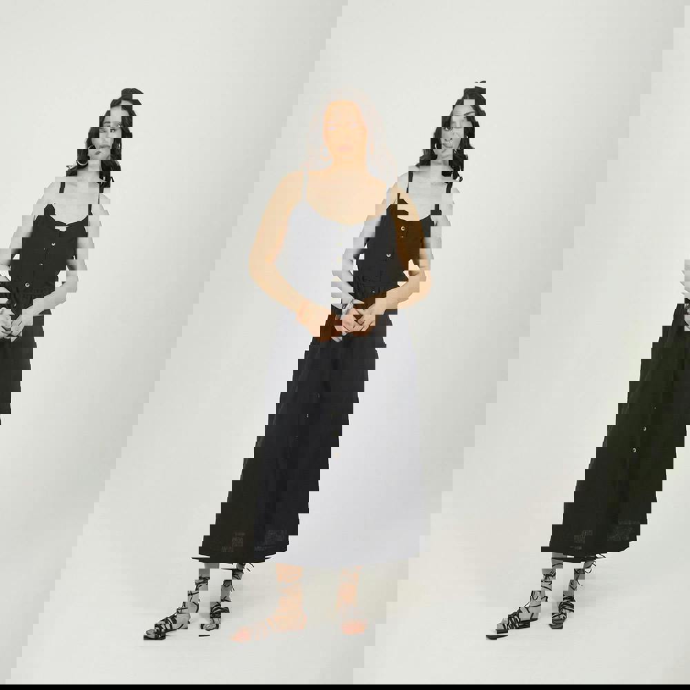 Easy, breezy, and effortlessly stylish, this plus size midi dress is your new warm-weather go-to. Designed with a flattering midi length, it brings a timeless feel to any casual look. Adjustable straps let you find your perfect fit, while the shirred panel at the back adds stretch and comfort. Finished with front button detailing and two handy patch pockets. Model wears UK size 18.