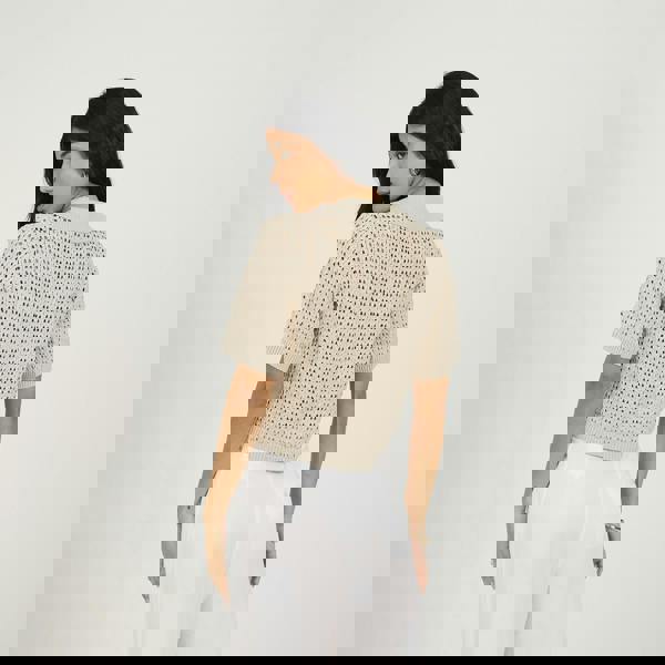 Add a touch of texture to your wardrobe with this knitted top. Designed in an all-over open pointelle knit, this piece brings a lightweight, breathable feel with a feminine edge. Featuring an open neck and ribbed collar, cuffs, and hem, it balances softness with structure. The cropped length makes it perfect for pairing with high-waisted jeans for an effortless, on-trend look. Model wears UK size S.