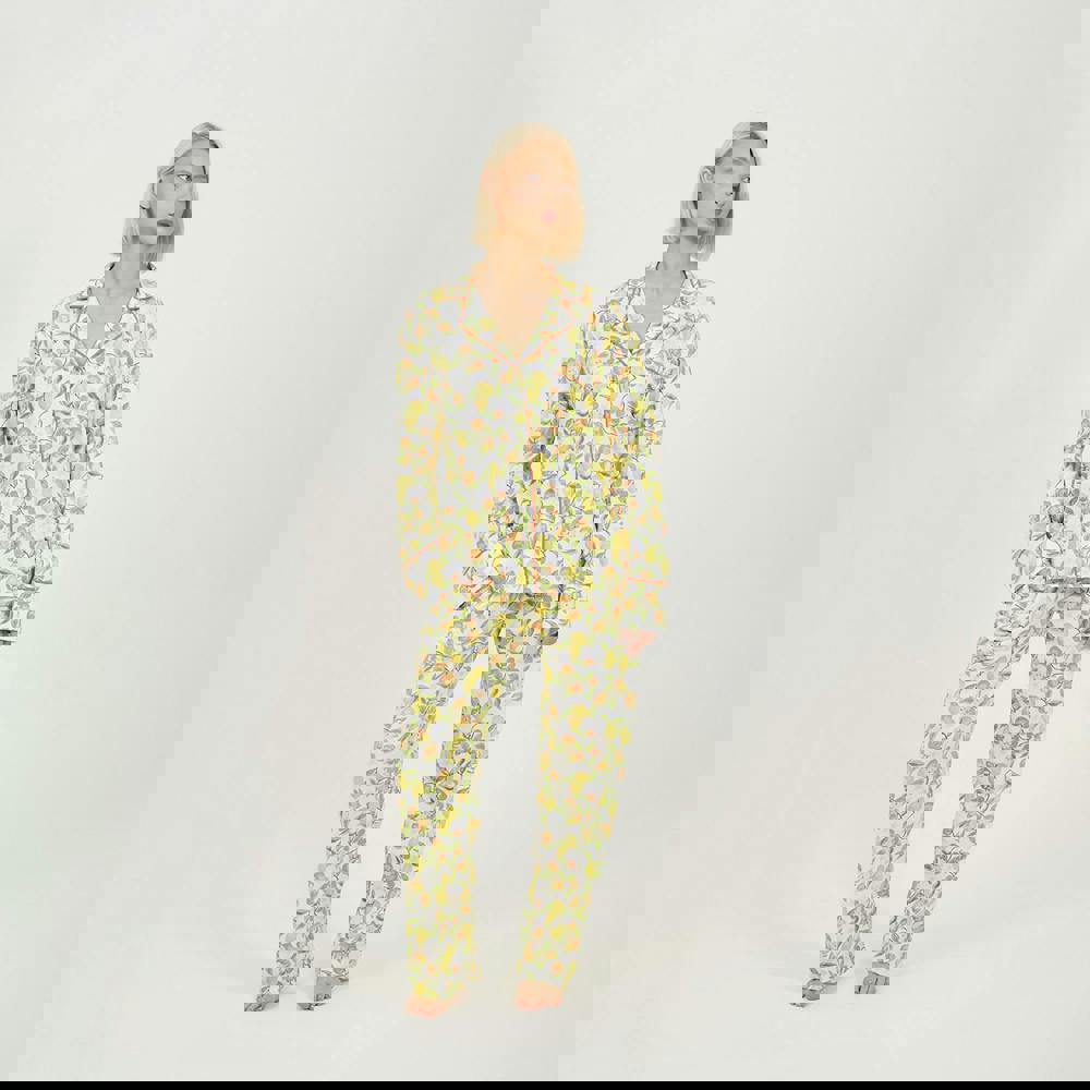 Drift into comfort with this pyjama set, crafted from 100% cotton single jersey for a soft, breathable feel. Designed with a collared neckline and binding edge for a polished finish, the set includes a long-sleeve top with button-through fastening and matching wide-leg bottoms featuring an elasticated waistband. Finished in a playful print, perfect for cosy nights in. Model wears UK size S.