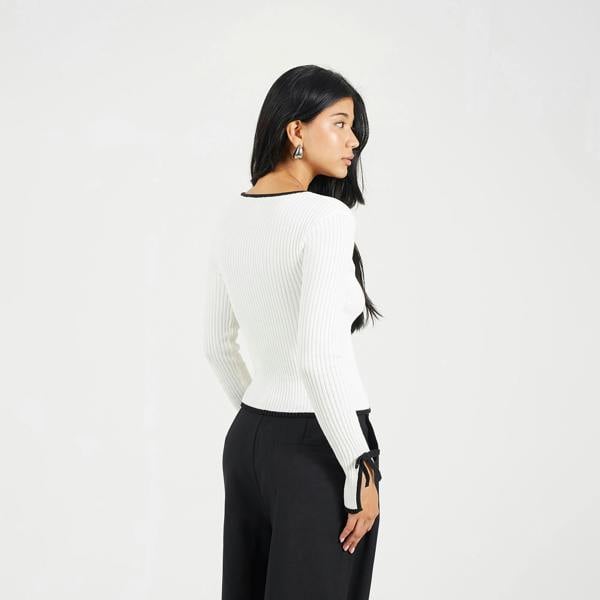 Enhance your style with this V-neck ribbed cardigan. Crafted from 100% cotton and features an open front with bow fastening, long sleeves, with split cuff detail and contrast tipping. Team with a pair of wide-leg trousers for an elevated stylish look. Model wears UK size S.