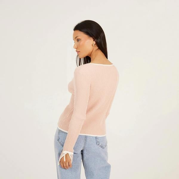 Enhance your style with this V-neck ribbed cardigan. Crafted from 100% cotton and features an open front with bow fastening, long sleeves, with split cuff detail and contrast tipping. Team with a pair of wide-leg trousers for an elevated stylish look. Model wears UK size S.