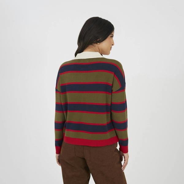 Sport a casual yet stylish look with this jumper. Designed in a classic rugby style, it features long sleeves, a contrast collar, and a button placket for a traditional touch. The bold all-over stripe pattern adds a sporty edge, while the soft knit finish ensures comfort, making it perfect for relaxed everyday wear. Model wears UK size S.