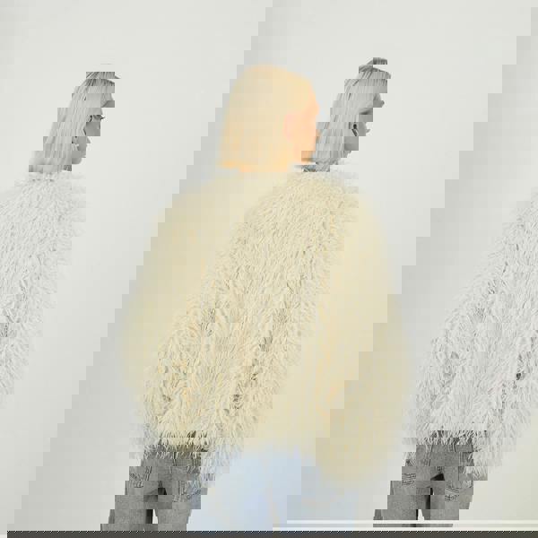 Elevate your outerwear with this jacket, crafted from all-over faux Mongolian fur for a bold, textured finish. Featuring a classic round neck and secure hook-and-eye fastening, it offers a sleek silhouette while keeping you warm. Two concealed side pockets complete the design, blending style and practicality for effortless winter dressing. Model wears UK size 8.
