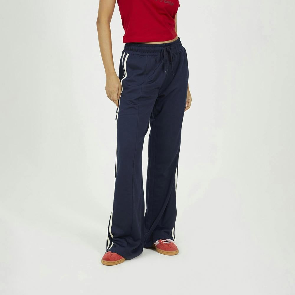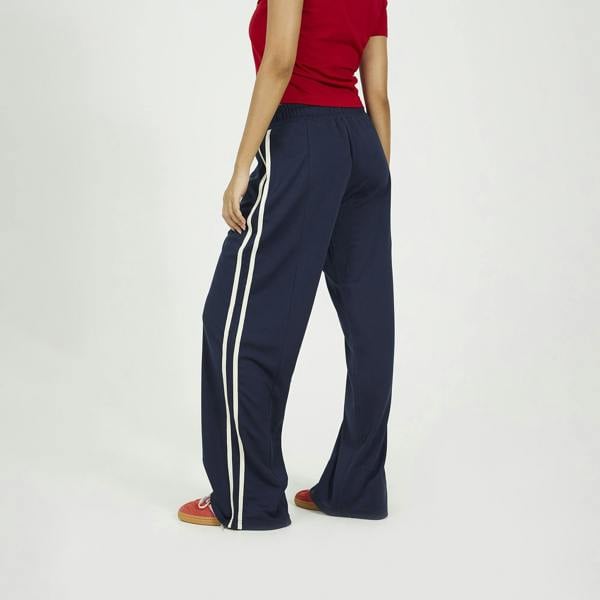 Stay effortlessly on-trend with these joggers, designed in a classic track style. Featuring a wide-leg silhouette, elasticated drawcord waist, and front seam detailing, they offer both comfort and style. Two waist pockets and a contrast side stripe add sporty flair, making these joggers perfect for casual days or athleisure-inspired outfits. Model wears UK size S.