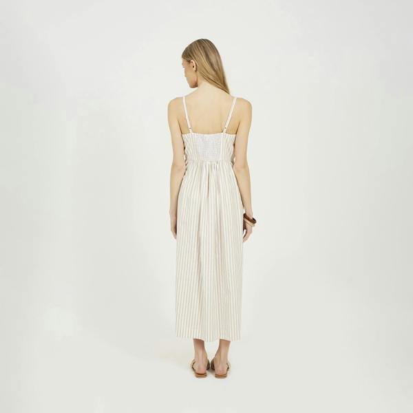 Easy, breezy, and effortlessly stylish, this midi dress is your new warm-weather go-to. Designed with an all-over stripe pattern and flattering midi length, it brings a timeless feel to any casual look. Adjustable straps let you find your perfect fit, while the shirred panel at the back adds stretch and comfort. Finished with front button detailing and two handy patch pockets. Model wears UK size S.