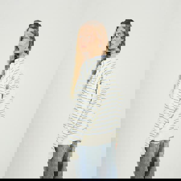 Add a pop of print to your casual wardrobe with this sweatshirt. Featuring long sleeves and an all-over stripe design, it’s finished with a contrast crew neck for a sporty twist. Chest embroidery adds subtle detail, while ribbed neck, cuffs, and hem provide a comfortable, secure fit—perfect for everyday style. Model wears UK size S.