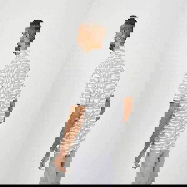 Stand out in everyday style with this polo, featuring a bold all-over stripe pattern and a modern trophy neck design. The short-sleeved silhouette offers a laid-back feel, while the self-fabric neck tape adds a subtle touch of structure and comfort. Ideal for smart-casual looks, this polo delivers effortless style with a contemporary twist. Model wears UK size M.
