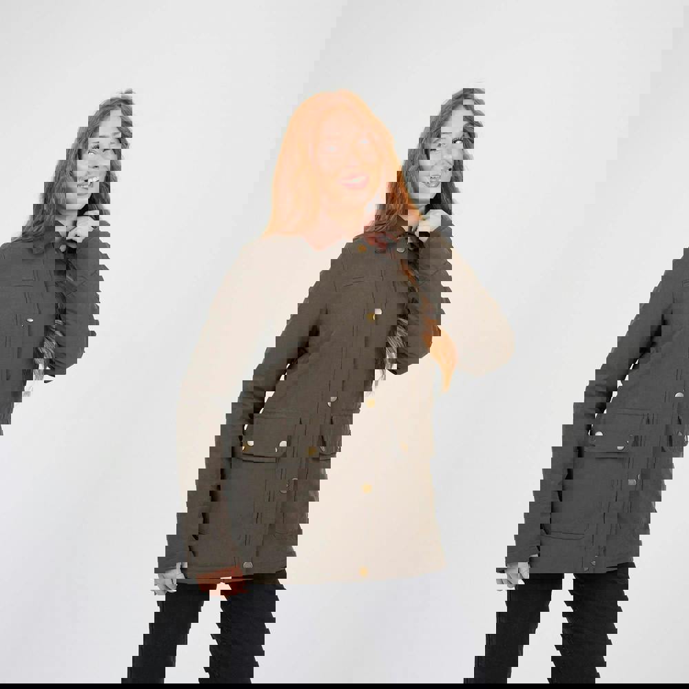 Elevate your transitional wardrobe with this twill jacket. This practical twill moss bonded jacket with contrasting corduroy collar features full zip fastening with popper details and two lower patch pockets with popper fastenings. Team with jeans for a classic outdoor look. Model wears UK size 8.