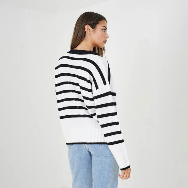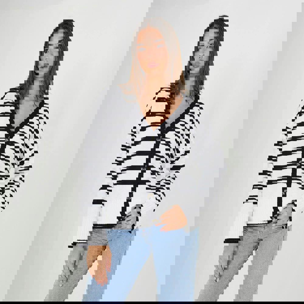 Discover this classic stripe cardigan. The V-neck, stripe pattern, ribbed cuffs, and button placket adorned with large mock horn buttons create a timeless and sophisticated look. Style over a simple tank and jeans for an effortless look. Model wears size S.