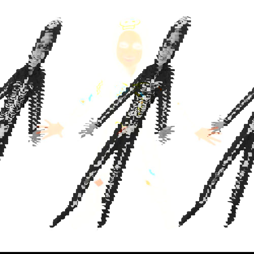 Made from 100% polyester, this costume is supplied as a coordinated set to create a complete skeleton look. Please note that additional accessories shown or suggested may be required to finish the outfit as desired.