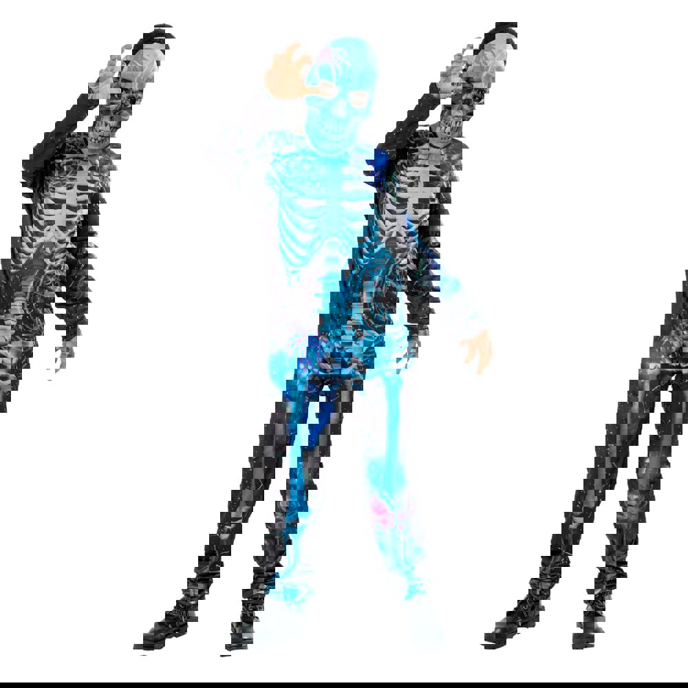 Bristol Novelty Boys Skeleton Costume is a pull-on fancy dress outfit in EVA foam, finished in black and blue with a neon printed skeleton design. The jumpsuit has a crew neckline and long sleeves, with a glow in the dark effect for added impact in low light. A matching mask completes the look.