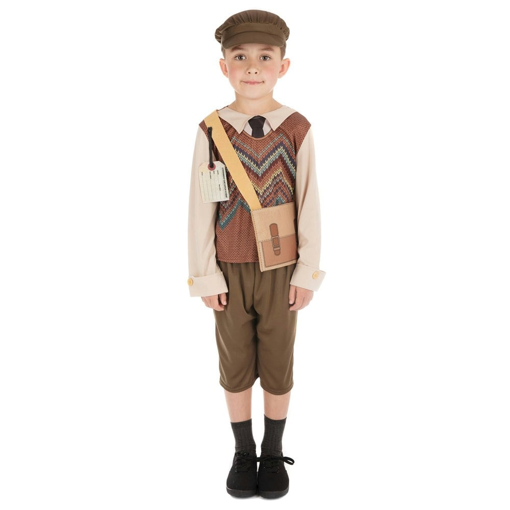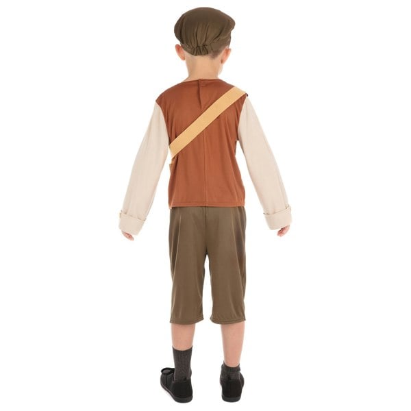 This children’s evacuee schoolboy costume is designed for dressing up and themed events. It includes a long-sleeved top paired with shorts that fall just below the knee, creating a coordinated outfit for role play.