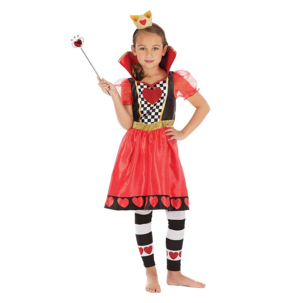 Bristol Novelty Queen of Hearts costume for children comes as a coordinated outfit in red, black and white. The dress has a checkerboard bodice, a heart-pattern hem and a high collar. Matching striped leggings complete the look, along with a crown headband. A wand is not included.