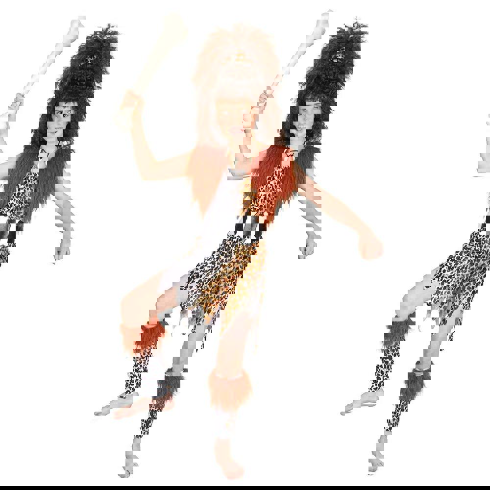 Bristol Novelty Childrens/Kids Cavegirl Costume is a multicoloured fancy dress outfit with a coordinated set of costume pieces. The set contains a dress with a belt, plus matching accessories to complete the look. A wig, necklace and leg covers are supplied as part of the outfit. Bone not included.
