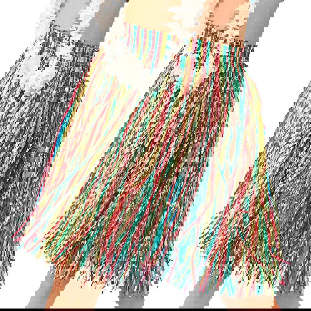 Bristol Novelty Childrens/Kids Fake Grass Skirt is a plastic grass-style skirt with a multicoloured finish. It has an elasticated waist for a flexible fit and a knee-length cut.