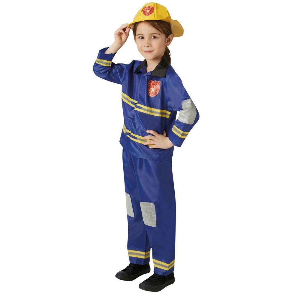 Bristol Novelty Firefighter Costume is a children’s costume set in blue and yellow, made from 100% polyester. It has a long-sleeved top with a turn down collar and touch fastening, finished with contrast detailing, stripe detail and text. Matching bottoms and a hat complete the outfit.