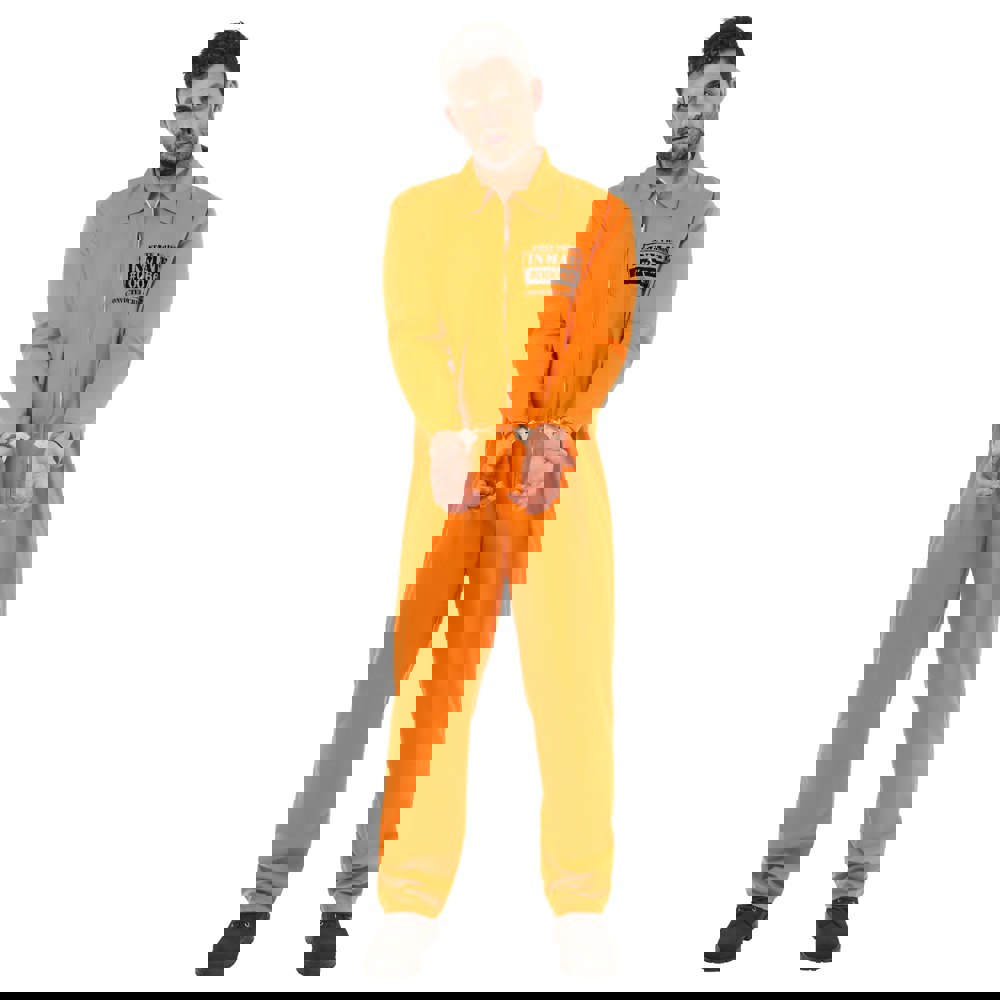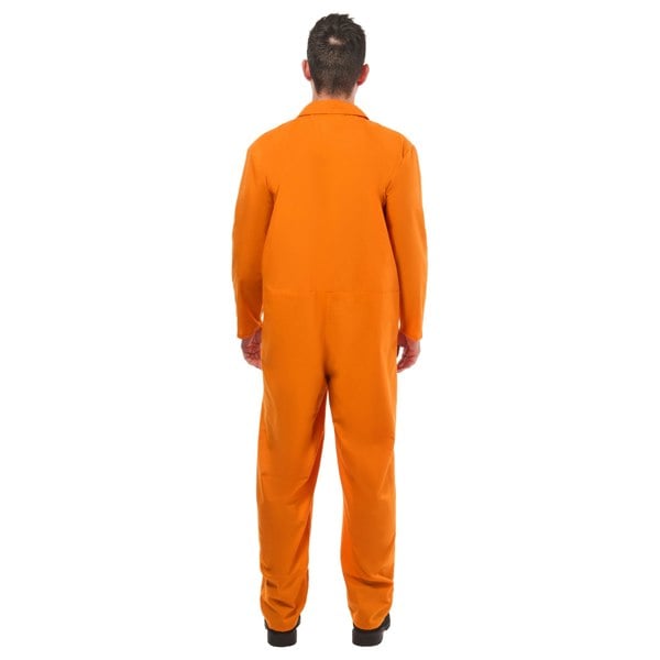 This costume features a text design and comes in orange for a classic convict-inspired style. With both pull-on and zip fastenings, it provides flexible wear depending on how you prefer to dress and adjust the fit during use.