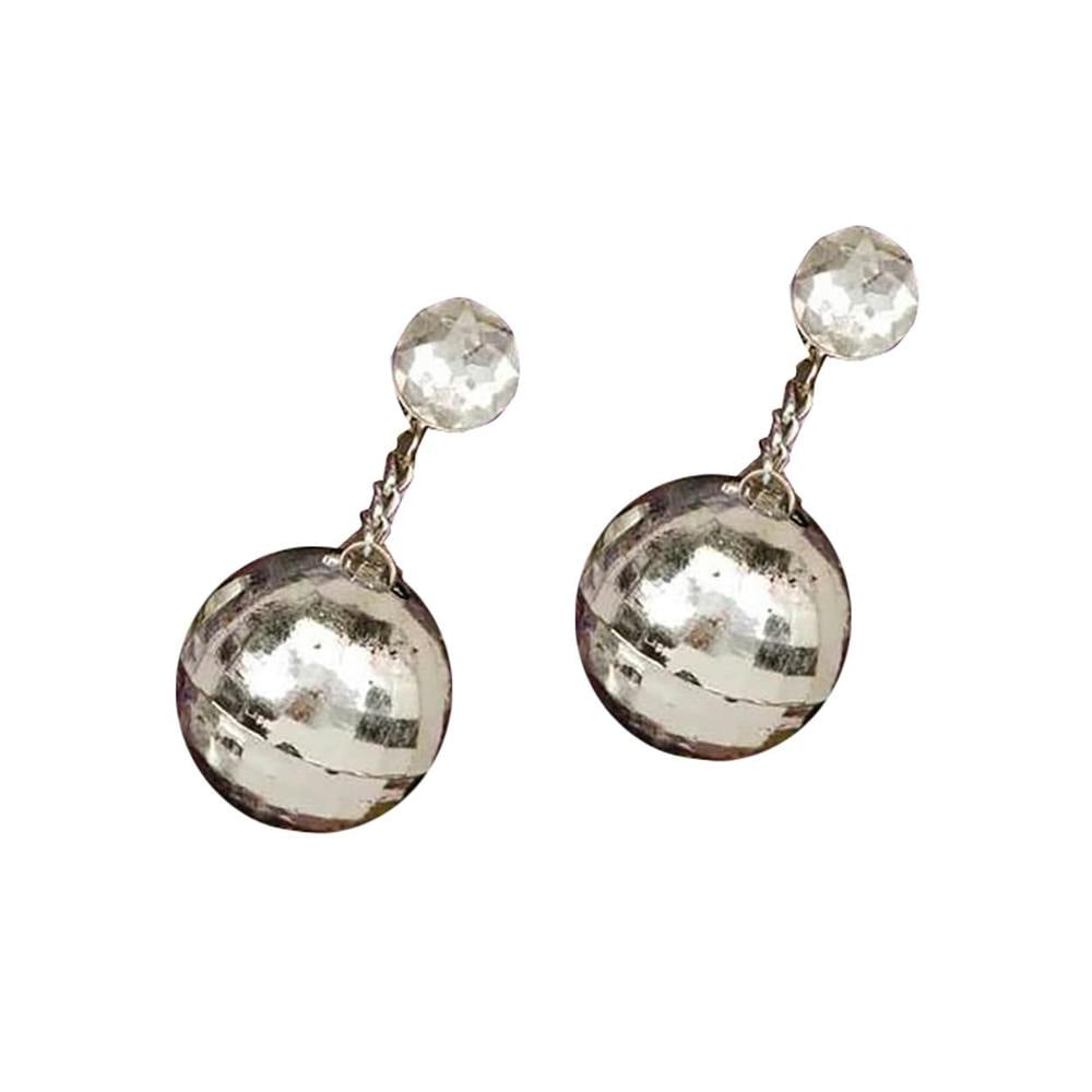 Each earring features a silver-tone disco ball that dangles from a chain, topped with a faux jewel detail for added sparkle. The drop design adds movement, helping the earrings stand out whether you are styling them with a full costume or using them as a statement accessory for a night out.