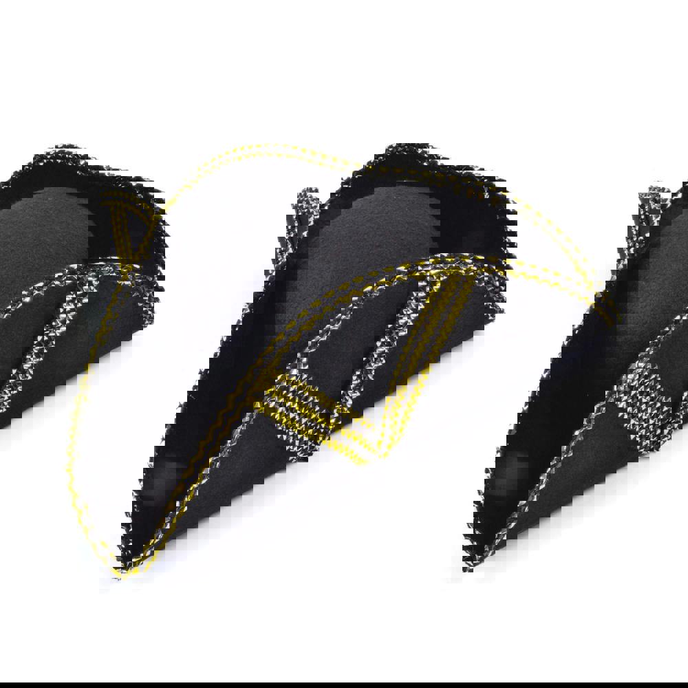 Made from synthetic material, this tricorn-style hat is suitable for unisex adults and is intended for fancy dress wear. The black and gold colourway makes it easy to coordinate with a wide range of costume pieces, whether you are dressing for parties, events, or stage use.