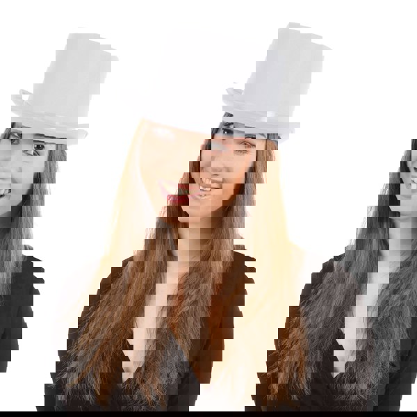 Add a polished finishing touch to your outfit with the Bristol Novelty Unisex Satin Top Hat in white. Designed in a short cylinder shape, this classic top hat is a simple way to complete a costume look for parties, themed events and fancy dress occasions.