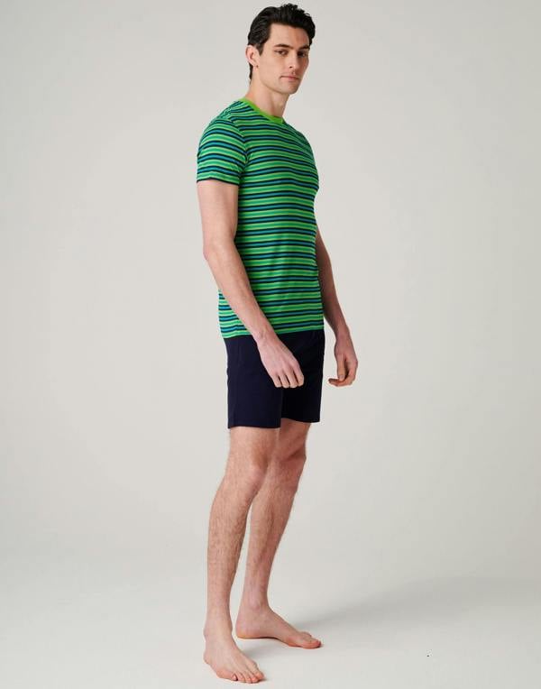 Brighten downtime with the British Boxers Men’s Bamboo Short Pyjama Set in Electric Lime. This two-piece set pairs a short-sleeve T-shirt with matching shorts, finished with a stripe design for a lively look. Made from a bamboo viscose blend with added elastane, it offers a soft, breathable feel for comfortable nights and relaxed mornings at home.