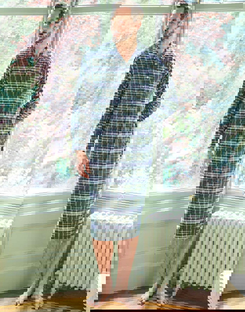 An absolute classic, this charming nightshirt is perfect for lounging or sleeping. It offers a relaxed, roomy fit for freedom of movement and all-night comfort. Made from soft brushed cotton, the fibres are brushed repeatedly for a luxuriously soft feel against the skin. Finished in a timeless design, it features French seams, a three-button neck, and a handy pocket.