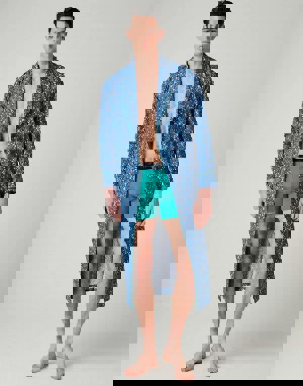 This men’s robe is finished with contrast-colour piping along the edges and a shawl collar for a clean outline. Practical details include two front pockets, inside ties and a belt tie for secure wear. Matching pieces are available within the Marrakesh Paisley collection, including pyjama, nightshirt, pyjama trouser and sleep short separates.