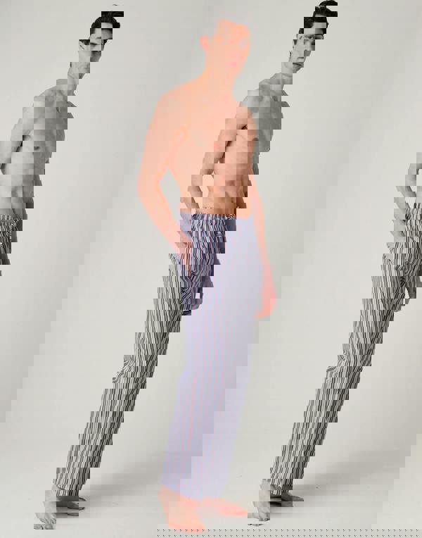 An elasticated waist with a self-fabric tie keeps the fit adjustable, while practical pocketing includes two inset side pockets and two rear patch pockets. An open fly completes the traditional pyjama-trouser styling.