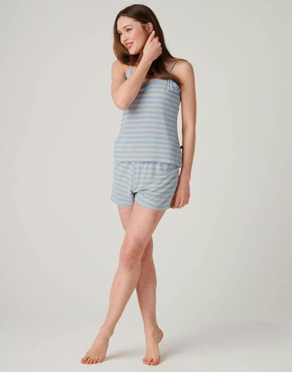 Soft stripes and delicate detailing give the British Boxers Bamboo Lace Camisole Short Pyjama Set a refined feel for women’s nightwear. The Cornish colourway pairs sand and baby blue stripes with a camisole top finished with lace detailing, creating a light, considered look for warmer nights.
