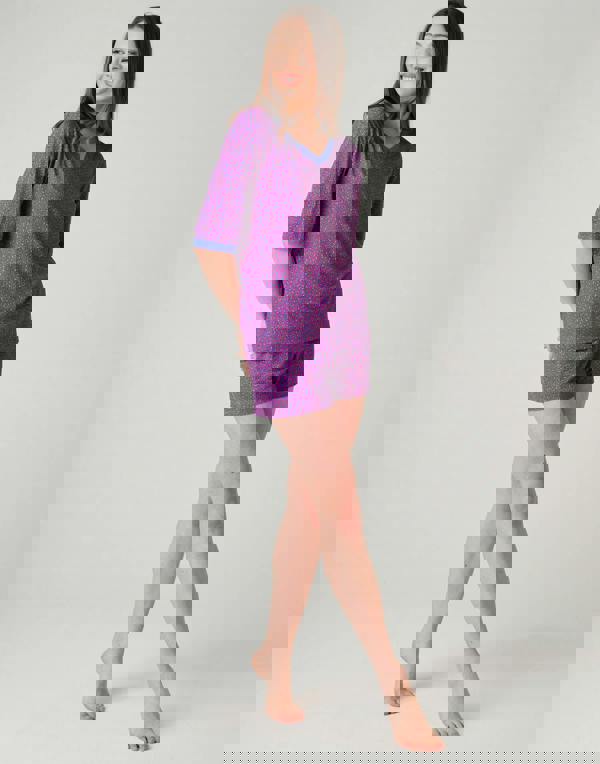 Bold pink and blue leopard print gives this two-piece a standout look, suited to warm-weather nights and relaxed lounging. Practical touches include pockets on the shorts, keeping everyday essentials close at hand.