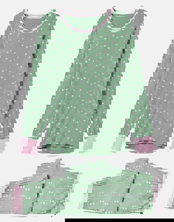 Our bamboo pyjama set in juniper polka is simply fabulous. Featuring long sleeves and jersey cuffs at the ankle, this set is finished with a silky soft waistband and pockets—because who doesn't love pockets? Designed with all the fine details you need, it’s the way the fabric feels against your skin that truly makes this set special. Made from bamboo jersey with a touch of elastane for added stretch, the fabric has a luxurious, silk-like quality that makes you feel like a million dollars. The juniper polka design adds a playful yet elegant touch to your loungewear collection. Perfect for cosy winter nights under a hoodie, dressing gown, or brushed cotton sheets, and equally great in summer for a cool, comfy option to wander around the house in. We can't recommend these PJ sets highly enough!